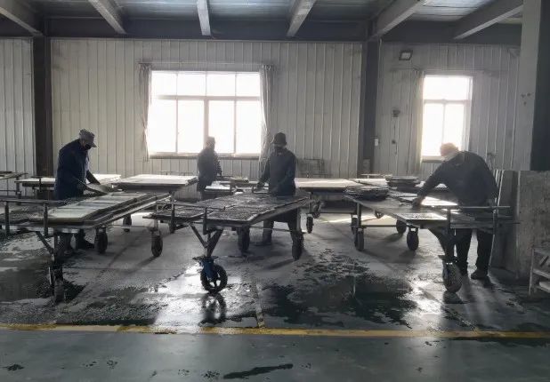 12月2日一大早,位于邙岭镇工业园区的万堂砖雕生产车间内已经开始忙碌起来,闭环管理的工人们规范佩戴着口罩,在各自岗位上有序操作,将生产的浮雕壁画进行起模、质检、装箱、搬运、发货,各环节分工明确,有条不紊,热火朝天的生产氛围迎面而来。